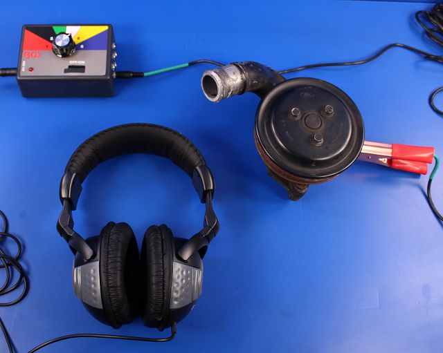 Mit Hilfe des elektronischen Stethoskops können die Geräuschquellen selektiv ausfindig gemacht werden. Bis zu sechs Prüfköpfe (Mikrofone) können an die zu prüfenden Baugruppen angebracht werden. Ein Umschalten auf die verschiedenen Köpfe durch den 6-Wege-Verstärker ermöglicht eine genaue Lokalisierung der Geräuschquelle während der Fahrt. Die nachstehende Abbildung zeigt einen exemplarischen Prüfaufbau am Beispiel einer demontierten Kühlmittelpumpe.