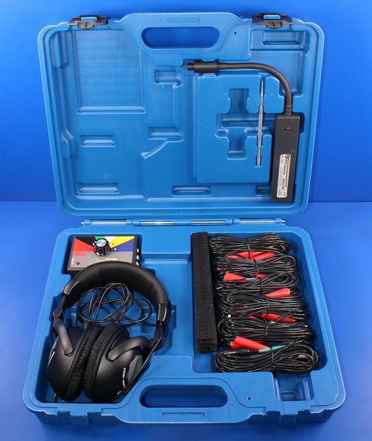 Möchte man während der Fahrt lastabhängig und unter verschieden Betriebszuständen die Geräuschquelle im Motorraum selektieren ist die Verwendung von elektronischen Stethoskopen mit kabelgebunden Prüfköpfen oder elektronische Stethoskope mit kabellosen Prüfköpfen angezeigt. Die nachstehende Abbildung zeigt ein elektronisches Stethoskop mit kabelgebunden Prüfköpfen.
