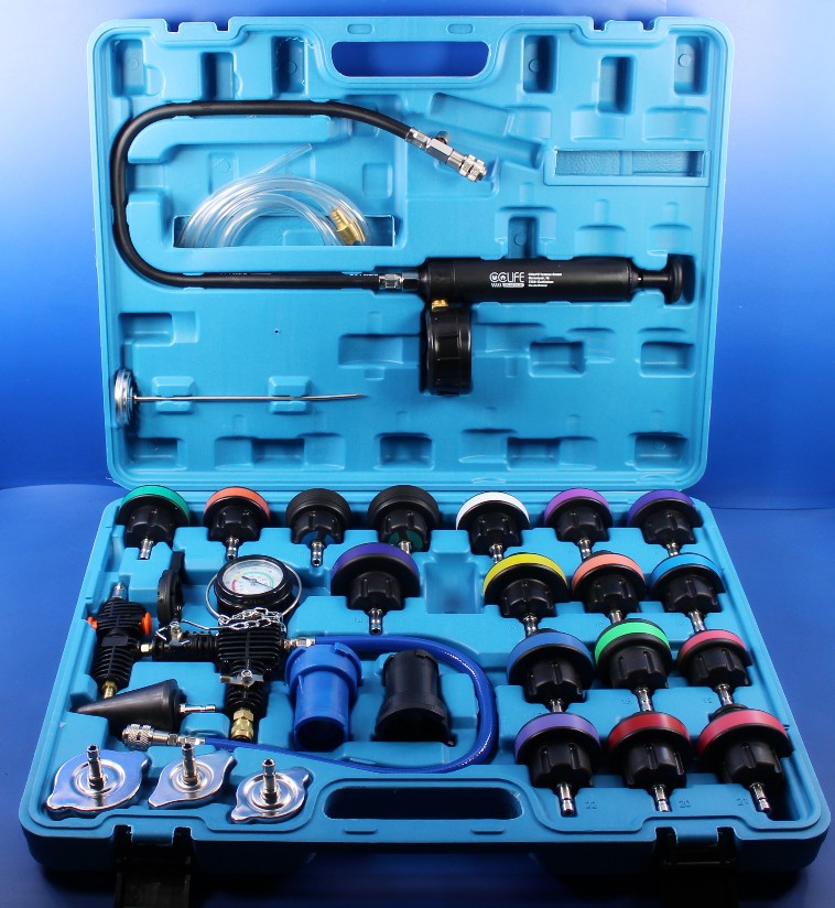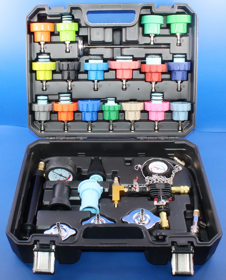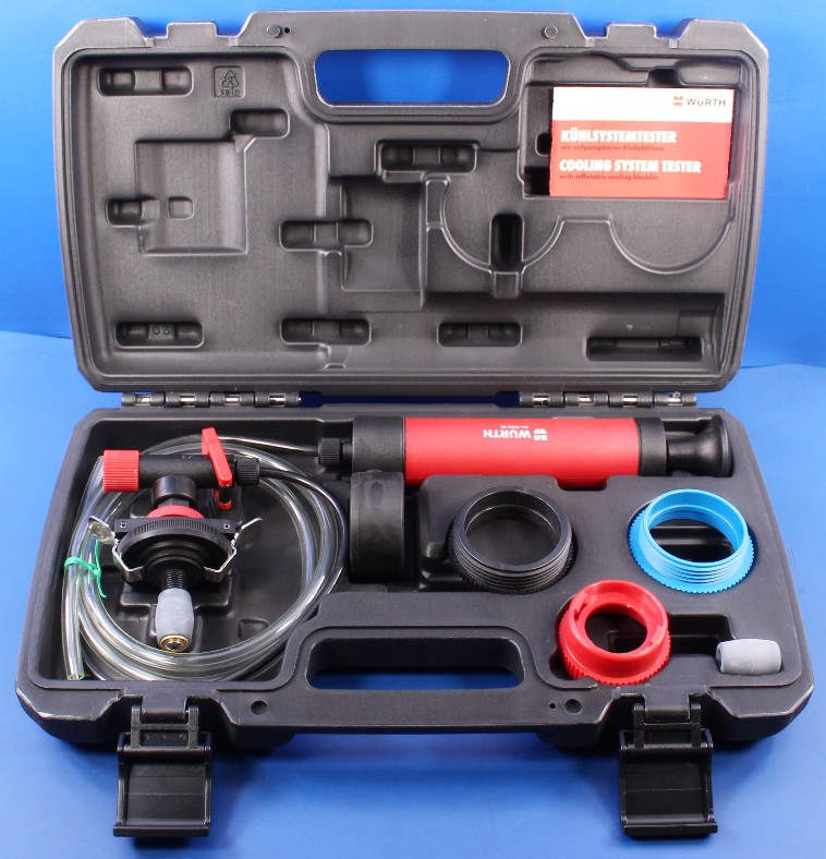 Das Prüfwerkzeug für die Druckprüfung des Kühlsystems werden zu erschwinglichen Preisen in Koffren mit unterschiedelichen Adaptern angboten.