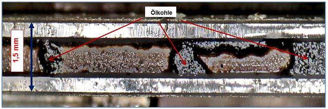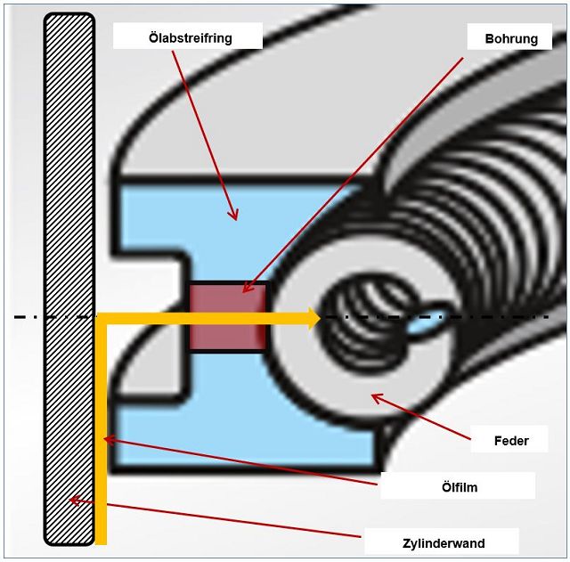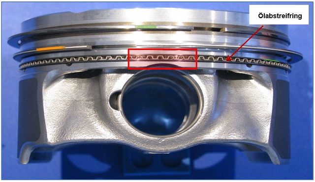 Diese Bohrungen in den Ölabstreifringe werden durch Verstopfungen oder Überdeckungen mit Ölkohle geschlossen, wie auf der untenstehenden Abbildung exemplarisch ersichtlich ist.