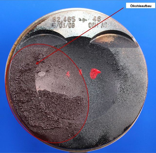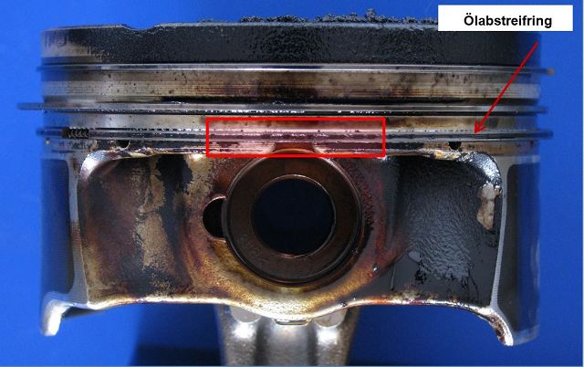 Dieser Ölabstreifring arbeitet im innermotorischen Betrieb des Motors nur mangelhaft und größere Mengen von Motorenschmieröl gelangt in die Verbrennungsräume und werden dort mit verbrannt. Die Verbrennungsrückstände setzten sich als Ölkohle auf die Kolbenböden, wie auf der untenstehenden Abbildung exemplarisch an einem demontierten Kolben aus den in Rede stehenden Motoren ersichtlich ist.