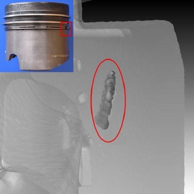 Aufgrund der heute sehr guten Qualitätssicherung der Produktion bei den OEM-Herstellern (Erstausrüstern) kommen Motorschäden bedingt durch Materialfehler respektive Herstellungsfehler äußert selten vor. Hier dient als Beispiel eine von meinem Labor untersuchte Lunkerbildung beim Gießen in einem Kolben. Dieser Werkstofffehler erzeugte eine Serie von schweren Motorschäden mit Blockdurchschlägen.